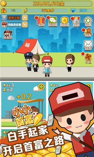 小小首富是一款新式放置点击类手游,玩家将操作角色白手起家,从最小的快递员做起。慢慢赚钱,开烧烤店,机械厂,到最后面的核电站!努力成为世界首富吧!新颖投资系统可以让你买下全国黄金地段!成为地王之王!房价都在我的操控之中!作为首富怎么能缺少萌宠和豪宅呢?