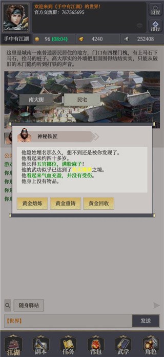 手中有江湖rpg游戏是一款非常经典的文字型江湖武侠游戏,文字型江湖世界真的无与伦比。以数十万文字基础为背景主题,化身江湖英雄,汇聚更多志同道合的英雄与你一起抗击外敌,非常经典的泥巴模式,词也可以形容有血有肉的江湖。