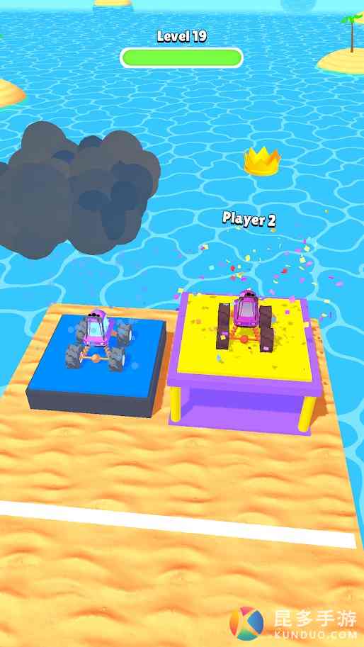 通过左右滑动屏幕控制车或船的移动位置,根据路况选择大脚车、推土机或船只,以保障前进速度。