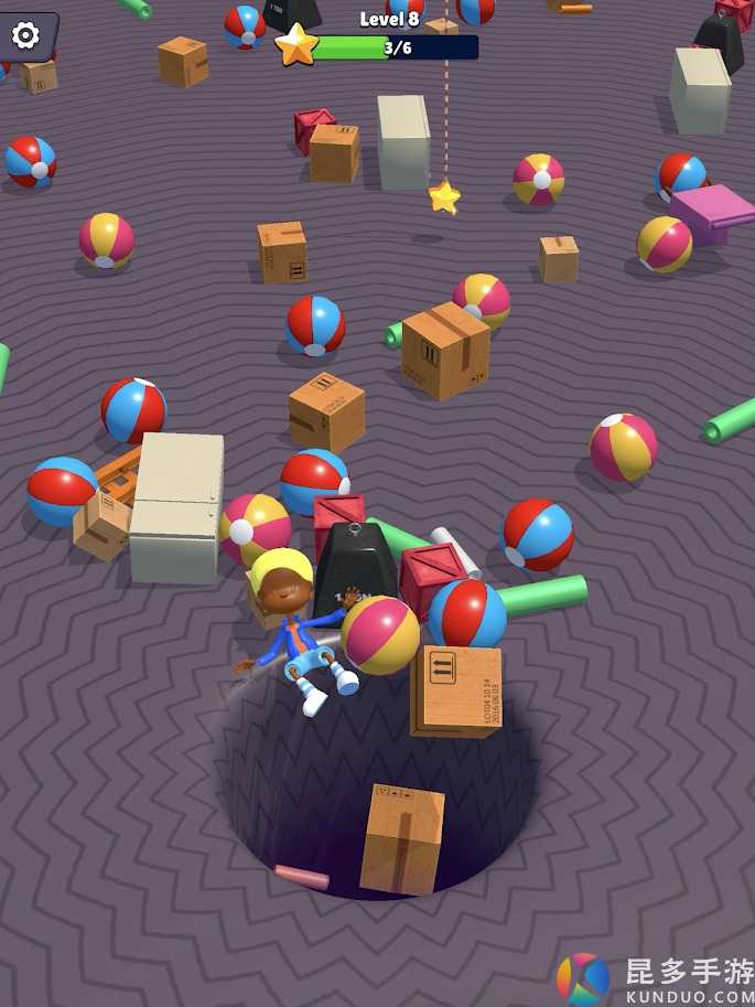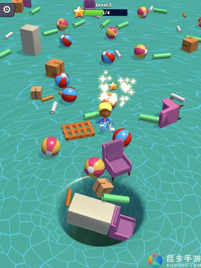 进入游戏后,你只需要滑动屏幕,控制人物移动,收集星星让自己快速通关,黑洞是不断吸收着周围的物品,所以一定要及时躲避才可以避免被吞噬。