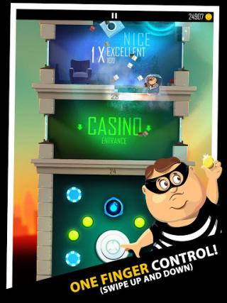 ▲游戏的画面非常简单而且可爱。注意到冰箱,冰箱可以让你拥有短时间内无敌的效果!如果准备好要往下跳了,就在画面上往下拨动。可千万不要忘记拿走所有金币了!另外你可以踩坏(破坏)家具等等物件来获得金币!