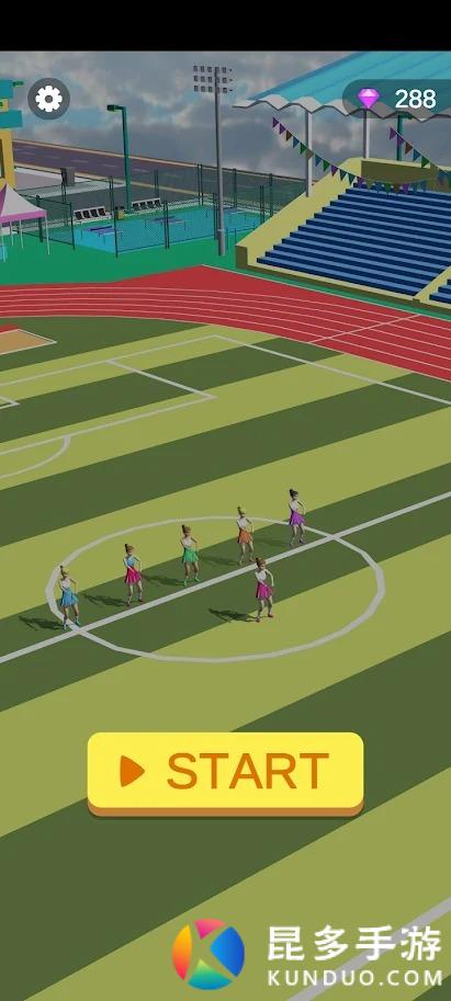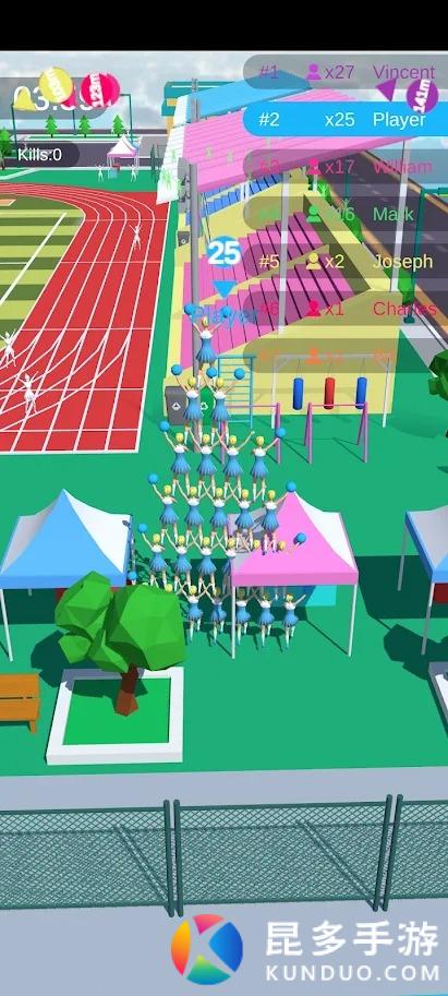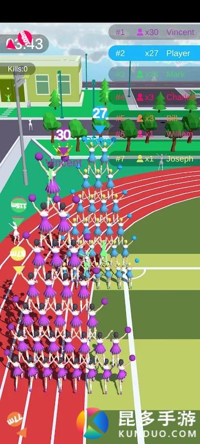 游戏玩法简单,滑动屏幕移动人物,不断收集白色的小人,扩大自己的啦啦队阵容,并在5分钟之内,不断强大自己。