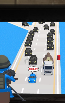 掩护小蓝车,小蓝车上一定有重要的人物,被身后无数辆黑色轿车追赶,你要在直升机上向黑色轿车射击,掩护小蓝车安全的到达终点才能完成任务,尽量利用油桶、大货车等道具,给小蓝车制造更多的逃生机会,总之不能让任何一辆黑车撞到小蓝车。