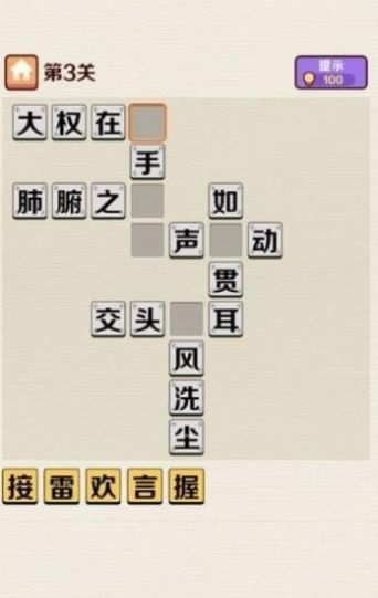 1、简约游戏界面,纯粹的文字答题模式,首尾连接的文字,挑战成语填空。