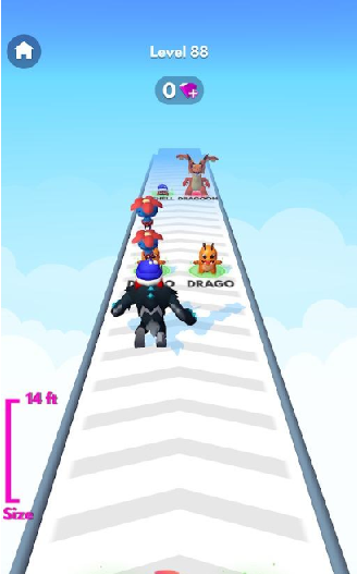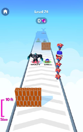 动物栈跑,开局你的小动物非常矮,躲不过那些高大的围墙,赛道上会出现多种多样的小动物,需要你在途中尽可能收集体积大的动物,收集的动物们会出现在小动物的头顶,小动物就会被压扁,慢慢找到一个合适的动物,逐渐收集,争取达到一定的高度,通过关卡。