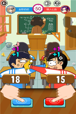 同桌大作战是一款非常有趣的休闲小游戏。这款游戏的画风采用的是卡通漫画风,非常的魔性有兴趣,让玩家感到到风趣的沉浸式游戏体验。这款游戏主要是对玩家手速的一个PK,在游戏里面玩家会匹配到另外一位玩家,在规定的时间里面,双方要相互击打,谁打到的次数次数最多谁就是获胜。再整个游戏过程中不仅考验玩家的手速,还要时刻注意老师的瞬间回眸哦,来找班主任的失望凝视,而且还要时刻注意教导主任趴在窗户偷看哦,让玩家在危险的边缘疯狂试探。在这款游戏里面可以让玩家在指尖体会到“123木头人”这一经典的游戏体验。本次小编带来的是同桌大作战游戏免费版,喜欢这款游戏的朋友赶紧来本站下载体验吧。