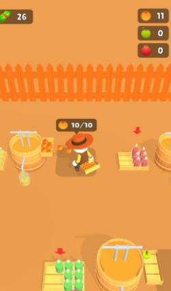 摇杆操控小人移动,到果树跟前会自动将果子打下来,然后走到榨果汁的地方,