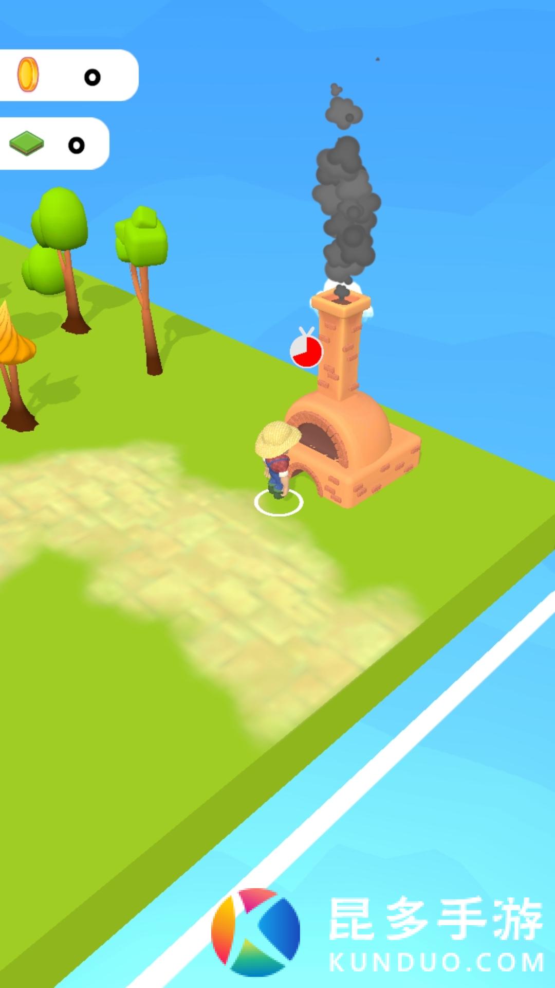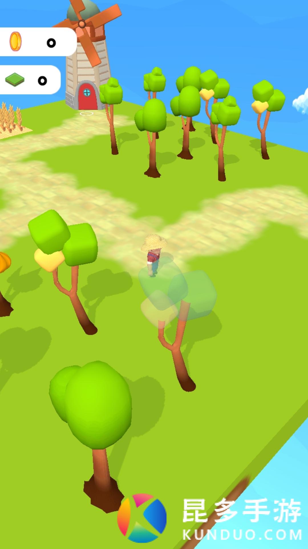 滑动屏幕就能控制主角移动了,到达树木边上时会自动砍树收集木材。