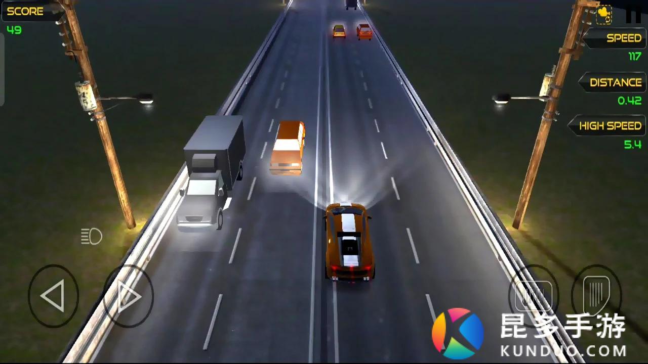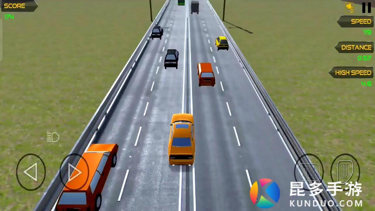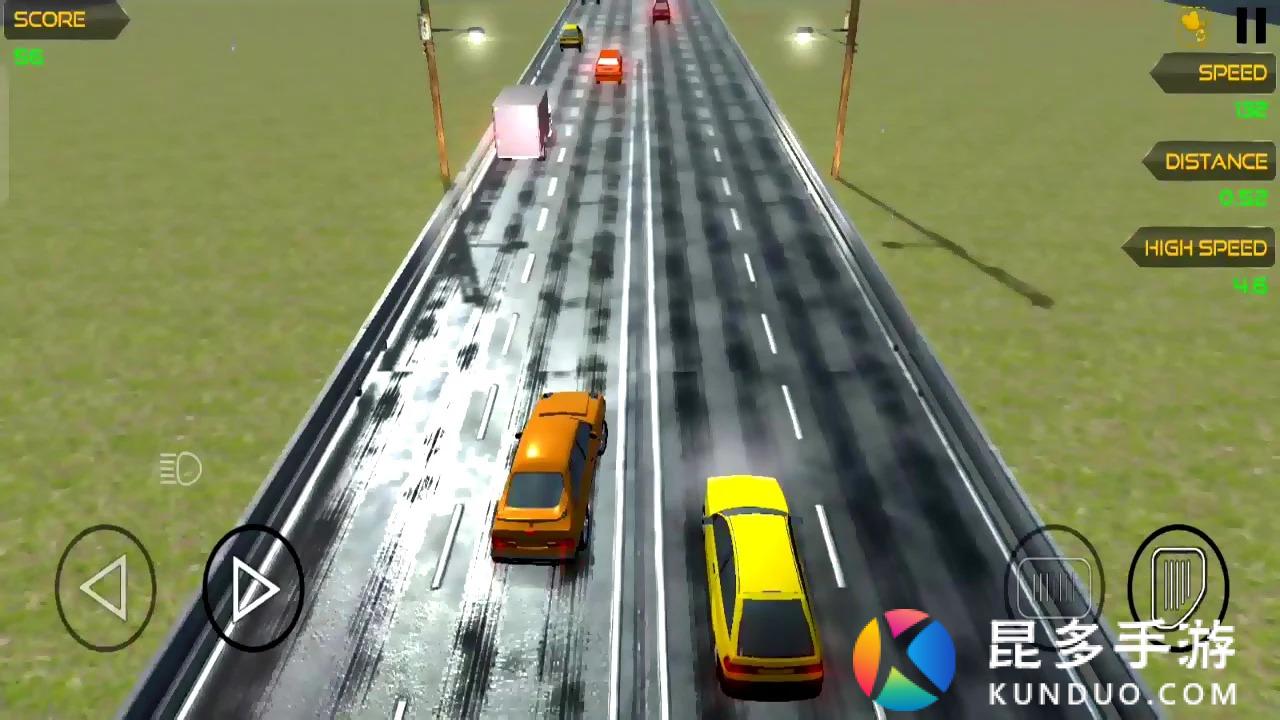 左右控制小车的方向,在方向键的上方可以鸣笛,右侧是油门和刹车,在跑道上行驶,没有尽头,你可以通过超车等方式获得金币。
