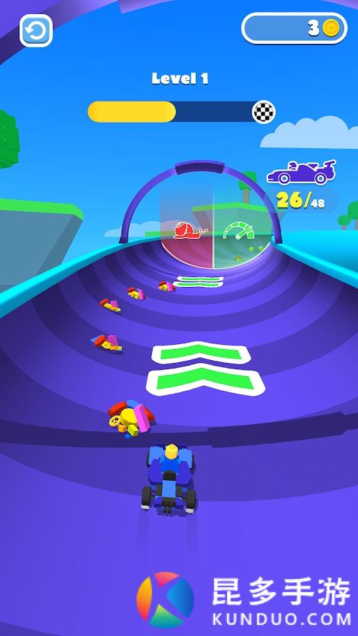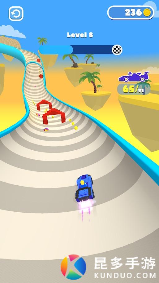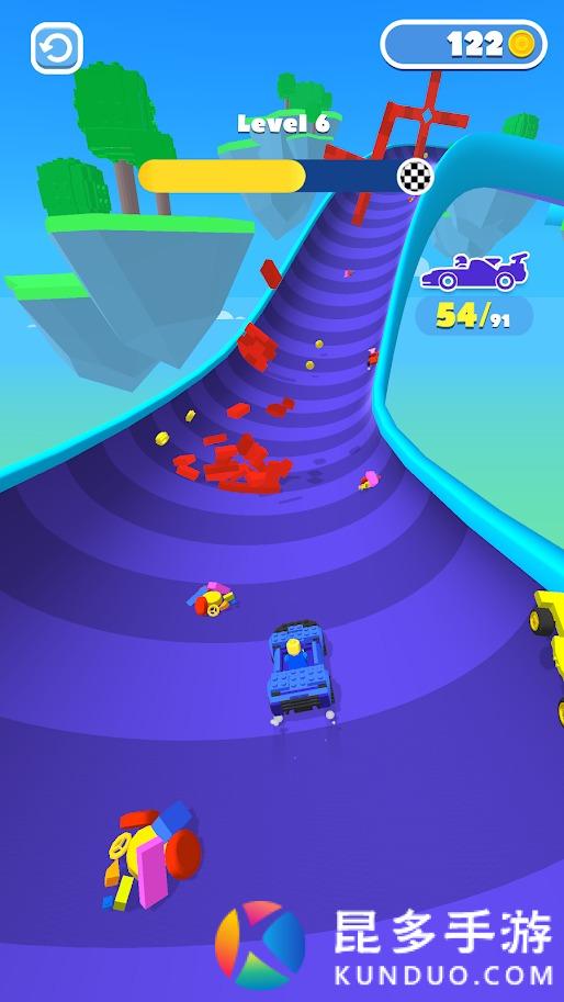滑动屏幕控制人物移动收集积木,将收集好的积木放在车附近的位置,自动组装,上车出发,长按屏幕加速,左右滑动屏幕控制汽车的方向,躲避陷阱和收集金币等等,成为赛场上的第一名。