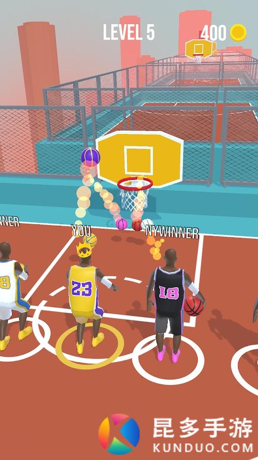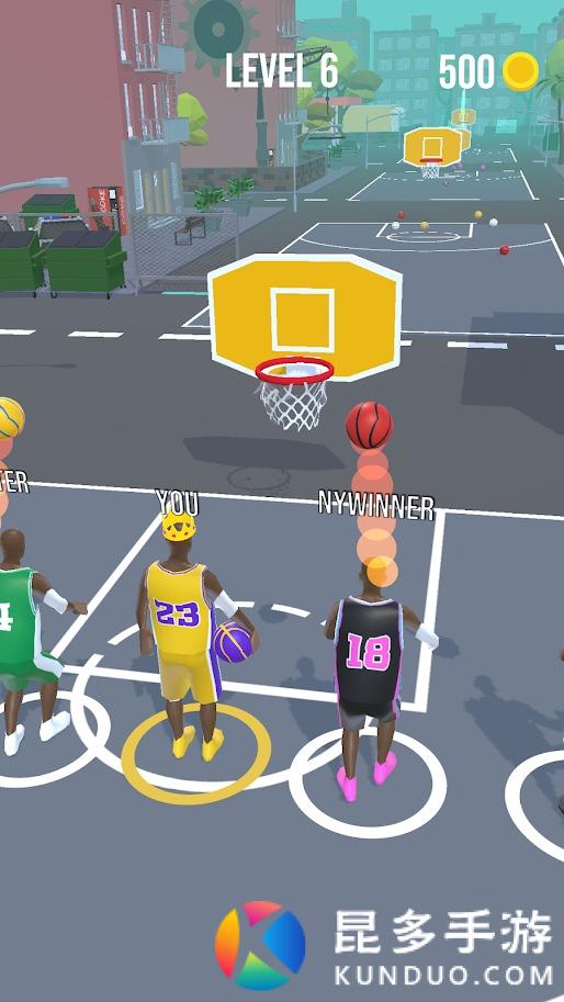 滑动屏幕出现一条抛物线,利用抛物线松开手指将球投掷出去,只要进框就会前进,继续下一个投篮,直到率先走到终点就能赢得胜利。