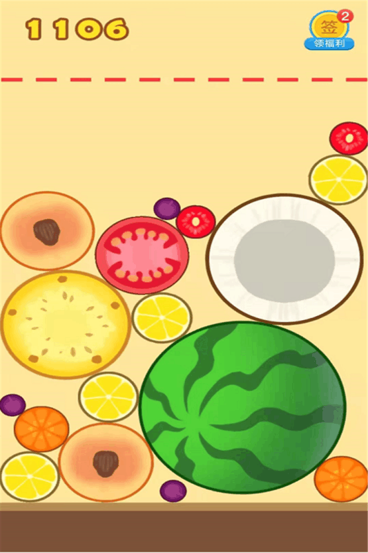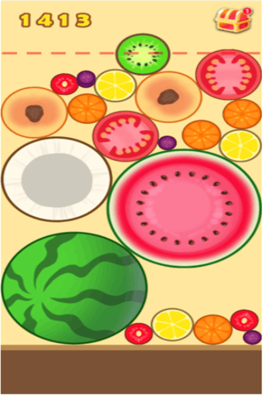 1、合成玩法大家都有玩过所以就不用多说,不过比起那种合成的只是颜色和大小上有一定变化之外,有些还是适度做出了创新——直接把水果加入进来,每次合成水果的横切面会直接被展示出来,直到最后合成西瓜的时候就是一整个立体形态,也算是游戏达到了目的,但还是可以继续合成,不过相对难度就会高很多了,因为剩余的空间无法再容纳第二个西瓜,简单来说合成第一个西瓜就代表游戏结束了一大半了,所以也算变相固定到下每局的体验时长。