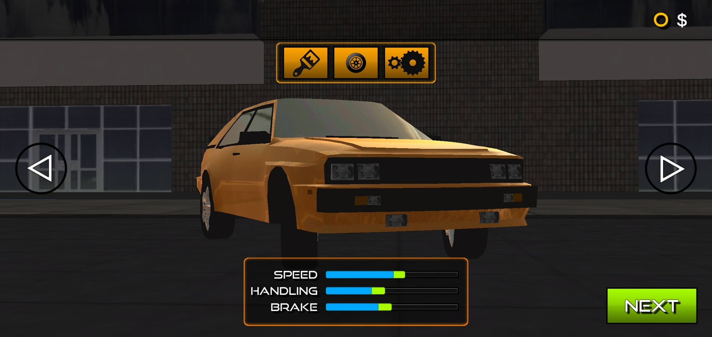 如图所示,点击左右控制赛车移动,点击油门加速,刹车减速,与其他车擦肩而过获得高分,撞击零分且重新开始游戏,获得的分数相当于金币,兑换多种赛车模型。