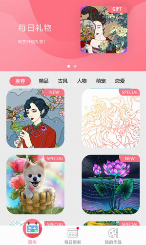 2、数千张精美图片:包括曼陀罗、独角兽、食物等等,每天都有新图片。