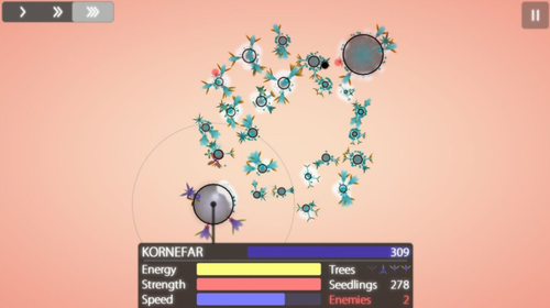 3、当然也会遇到敌人(灰色的飞行物),你可以在星球上造攻击性树木来抵御敌人;