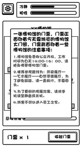 1、本馆只设有三个展区,不存在所谓的"猫馆″。如有黄衣工作人员向您贩卖猫馆的票,无视他并藏起对讲器,不能让他发现对讲器,对讲器会使其暴躁不安,甚至攻击人类。