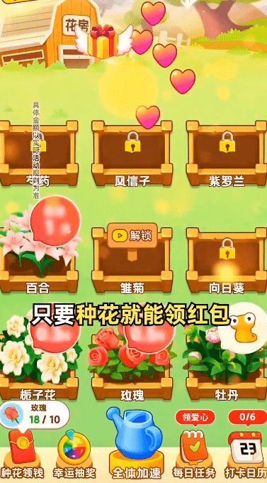 3.丰富多样的花种等你解锁,挑战不同花朵种植任务赚取红包。