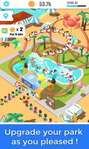 趣味的模拟经营游戏,玩家可以赚取钞票来升级自己的游乐园,解锁各种主题和建筑,吸引更多的游客,小编带来的是过山车大赢家修改版,不看广告就可以获得奖励,比如免广告获得双倍的金币,免费升级等等。游戏里玩家是能够去经营-个巨大的过山车公园,让游客有一种飞翔的感觉。让你的过山车更加壮观去升级您的游乐设施,根据乘客收入提高速度和操控性。过山车大赢家游戏里是要去收集更多的金币来增加收入,吸引更多游客去享受游戏。