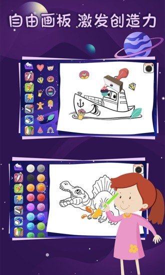 空白的纸张让宝宝的想象力在上面自由挥洒,不同的笔刷带来不同的质感,各式各样的印章给绘画带来了更多乐趣,超多颜色选择,提高宝宝对颜色的感知力。