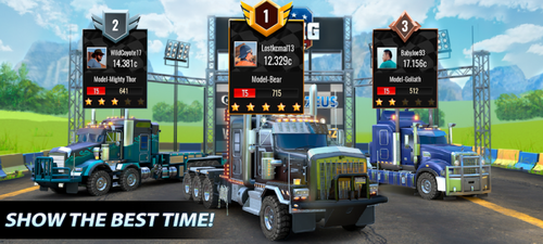 3、与传统的赛车游戏不同,游戏中的载具都是巨大霸气的卡车,开启一场全新的竞速体验。