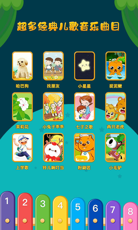 小毛驴、数鸭子、捉泥鳅、茉莉花、找朋友、哈巴狗、小兔子乖乖、铃儿响叮当、上学歌、七子之歌、小星星、两只老虎、粉刷匠等多首宝宝耳熟能详的儿歌童谣,跟着弹出的节奏唱起来