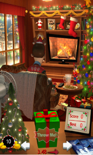 3、而我们要做的就是,拿着手中的礼物开砸吧~!要砸的对象就是那个正看电视的男人;