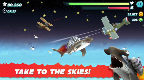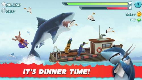 6、鲨鱼在游戏中获得的金币提升鲨鱼的速度、撕咬范围和饥饿值等各项指标,同时还可解锁掉更多的鲨鱼,供玩家选择。要是你的鲨鱼够凶狠,也可以凶狠地吞掉捕鲨猎人,太血腥了!