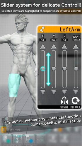 Easy Poser 模特所有关节都可以方便快捷地手动调节。选中的操作部分支持局部放大、局部复位、左右翻转或对称等超越一般虚拟人体app的强大功能!请您尽情体验远超鼠标操作的畅快感吧!