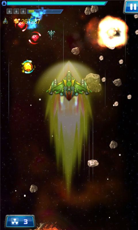 2、丰富厚重金币奖励、飞火流星冲刺、复活、火力加倍技能让你遨游太空;