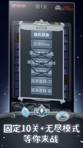 3.博弈模式一局游戏中有9个雷,探索地图寻找宝箱闯关。