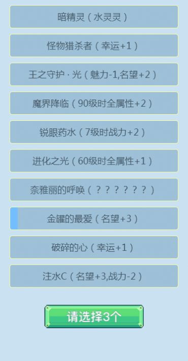 勇士重生模拟器是一款玩法非常新颖的文字冒险游戏。游戏中玩家将重生为异世界的勇士。玩家开局可以分配20属性点在颜值、名望、幸运、战力四个维度上。玩家的加点会影响后面角色的成长。游戏的剧情会根据玩家的选择不同而发生变化。