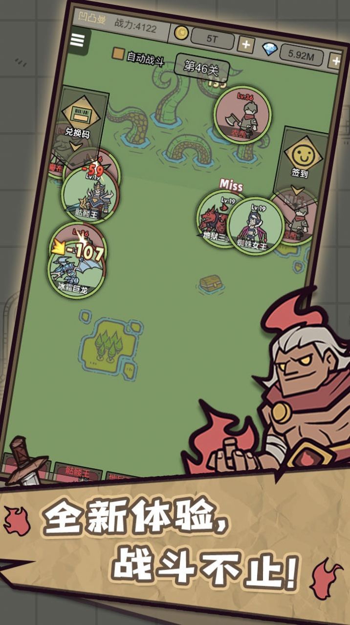画风独特,简单不伤肝。不断升级英雄,收集装备,轻松闯关。