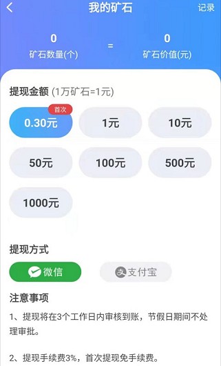 4、目前10000矿石可兑换1元,首次0.3元起提。