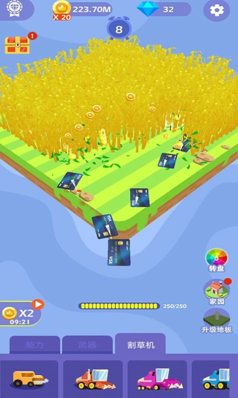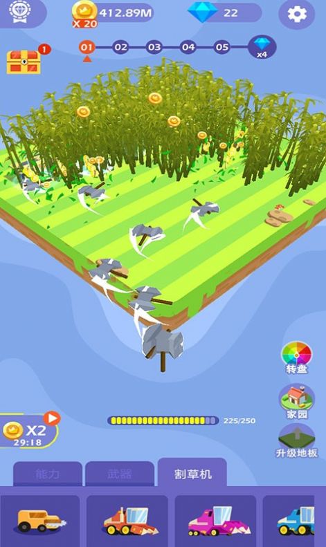 2、玩家可以通过不同型号的割草机进行收割,成熟首收割;