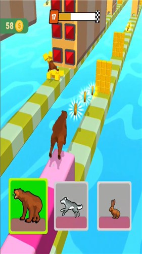 在这款动物大变身游戏中如果玩家碰到无法进行的障碍时候,就是说明自己的动物没有选择做正确,玩家可以通过反复的扫荡以前的关卡来获取有金币,这样玩家就可以解锁相应的动物来达成挑战闯关了,一局游戏中玩家可以选择的动物只有三个,所以玩家要仔细的规划。