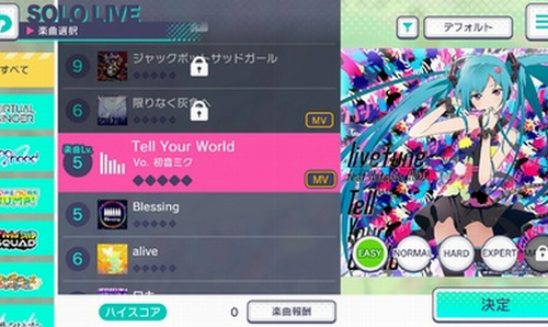 游戏有3种不同的音符,包括单点(TAP)、滑键(FLICK)、长按(HOLD)长按音符有机会跨越彼此,还可以糊。值得一提的是,游戏内的某些歌曲还会分成「原曲ver.」,与由虚拟歌手与原创角色共同演唱的「世界ver.」供玩家选择,而歌曲难度也从最简单的Easy到最上级的Master共分为五个阶段,让玩家能自由选择适合自己的难度游玩。