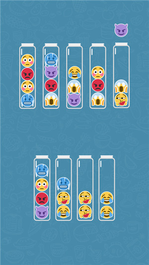 1.是一款经典表情排序解谜游戏,和水排序拼图很像。