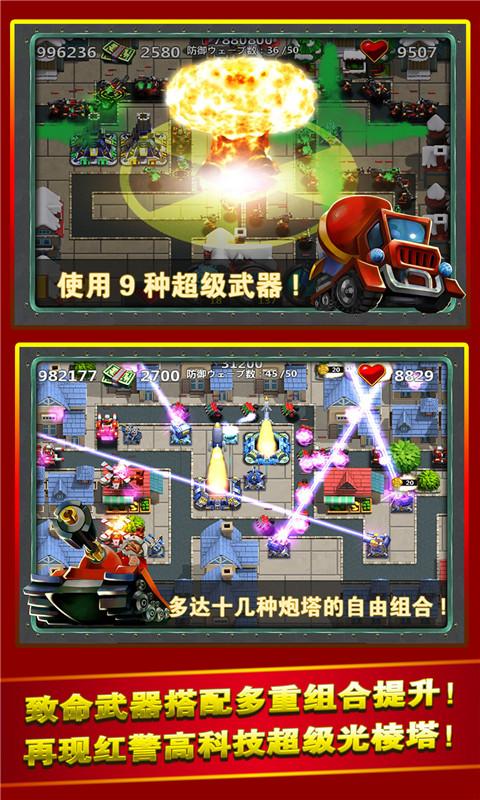 3、多达16种类型的炮塔可以升级,轻型炮塔,狙击步枪,地雷,导弹井等。