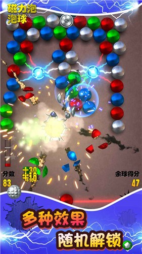 磁力泡泡球是一款玩法非常休闲的消除手游,游戏是基于泡泡龙进行改编的,整体的玩法区别不大,能够给玩家带来十分新颖的挑战,随着游戏的进行,你可以解锁更多的玩法,它们能够给你带去十分刺激的冒险,不同的关卡中还会出现一些道具,利用它们能够强化消除的效率,让你更好的完成任务,解锁更多的挑战。