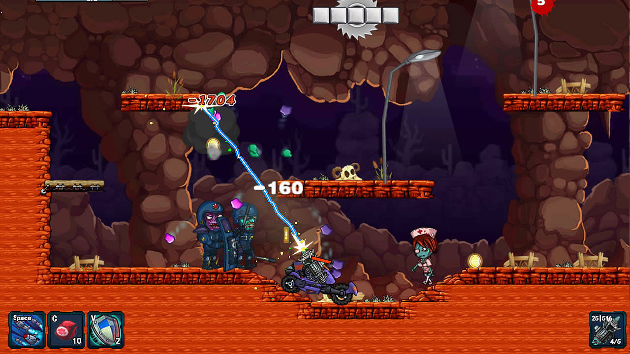 「末世英雄」玩法方面比较简单,采用横屏模式,左手控制人物的走位,右手则控制开火键。面对不断向我们扑来的丧尸,我们唯一能做的就是举起手中的武器,将眼前的丧尸全部给消灭干净!