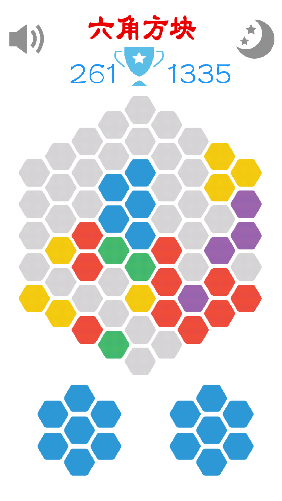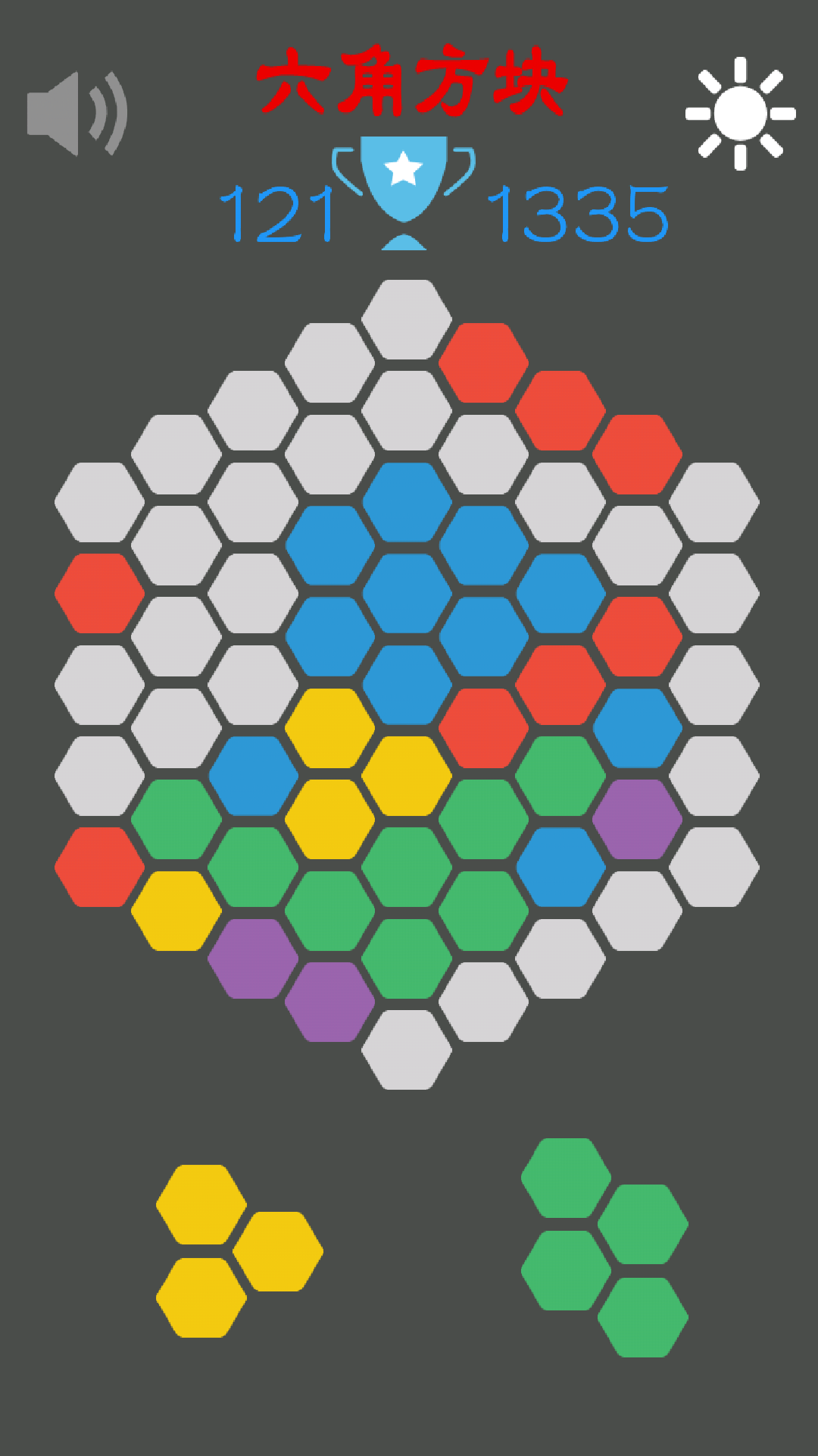 2.通过选择将六角方块将整行或整列或者斜列的方块进行消除,充满屏幕即结束。