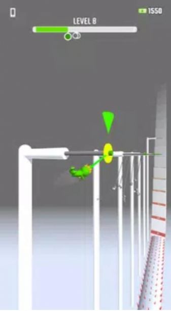 在游戏中玩家是来操作着一个火柴人不断的抛出钩绳去勾住上面的杆子然后让自己的火柴人不断的前进,在最终的阶梯上面你降落在数字更高的上面就可以获得非常多的金钱奖励了,趣味性是很不错的,对于玩家的手指灵活是会有一定的要求的。