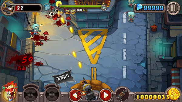 2、屏幕正下方的红色箭头是用来切换武器的,当你发现打得很吃力时,注意看看你的武器切换了没有,打爆难消灭的僵尸后奖励也是非常可观的