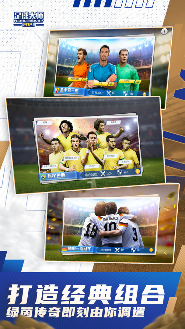 足球大师黄金一代是一款采用3D引擎打造的足球体育类游戏,游戏中玩家将扮演一名传奇球队教练,打造自己的梦幻球队,去赢得欧洲杯,世界杯的总冠军,这对于足球爱好者来说完全是他们的福音,不断训练你的球员的球技,开创不一样的精彩对战!