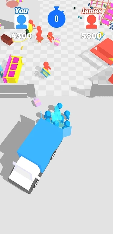 1、通过随意滑动屏幕控制角色移动,扫过商品带回起点装上卡车;