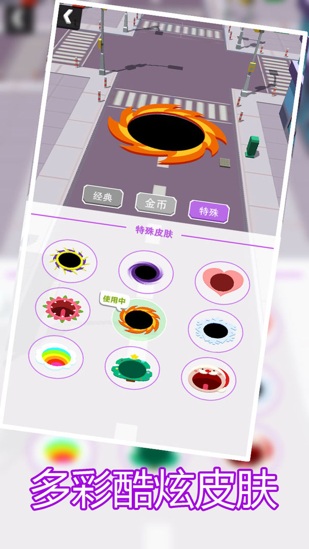 「黑洞大乱斗」城市街道上来了一群魔性黑洞,每一个黑洞都带有神奇的力量,为了获得成长,黑洞们只能不断的吞噬一切来让自己变强。快来操纵黑洞吞噬周围的一切,通过吞噬不断壮大自己,在本场竞技中角逐第一,体积最大者成为本场游戏中的王者吧!