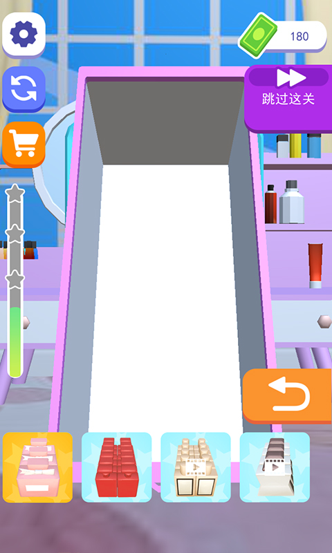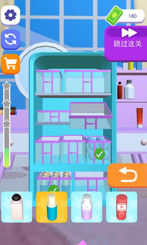 3、每个关卡给到的化妆品柜都是不同的,你需要将所有的化妆品整齐的放到柜子里才可以。