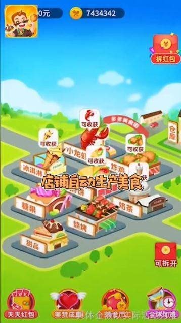 2.不断解锁更多美食,让自己的小吃街有更好的发展,赚取更多的红包奖励。