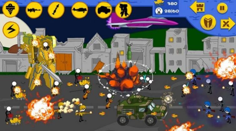 1、只需要点击屏幕就可以放置自己的炮塔和火柴人部队,连续点击会一直发射消灭敌人。