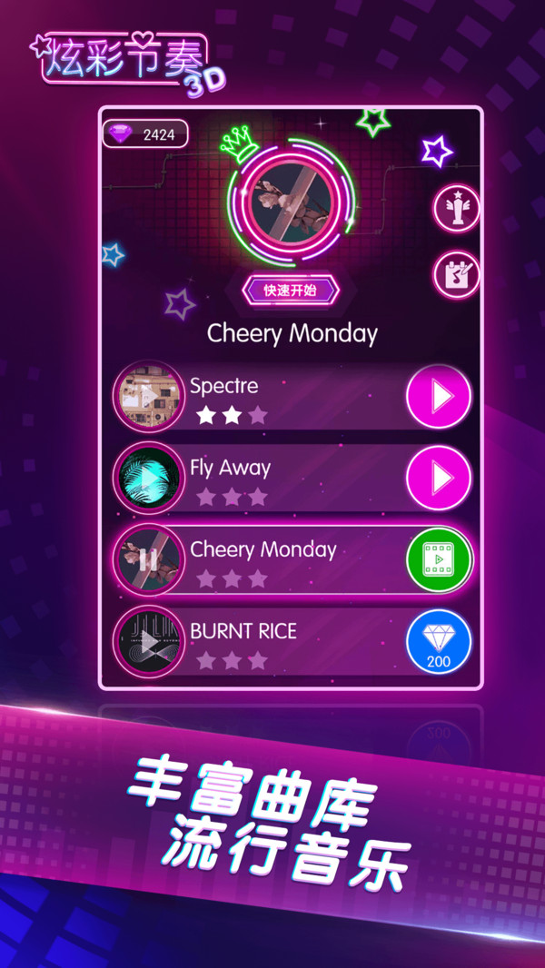 2、不同风格的背景音乐,带你领略不一样的挑战乐趣,解锁更多更流行的曲目。